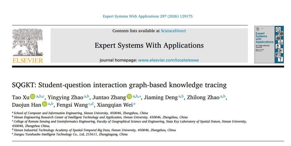 在研究成果二中,研究团队提出了一种基于学生问题交互图的知识追踪模型(SQGKT)。通过构建学生-问题交互图,将动态学习过程转化为图结构,更加直观地展现学生的学习路径和知识掌握情况。同时,还引入动态注意力机制,使SQGKT能够聚焦于关键信息,进一步提升了知识追踪的准确性和可靠性。三个公开数据集(ASSISTments 2009、ASSISTments 2012、Junyi)的实验结果表明,SQGKT模型的性能明显优于现有算法,为学生学习过程建模提供了新思路,为大规模因材施教战略的实施提供重要技术手段。该研究成果由河南大学计算机与信息工程学院、河南大学空间基准全国重点实验室、江苏云劭博智能科技有限公司等单位共同完成。