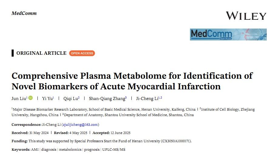 近日,基础医学院李继承教授团队在《MedComm》杂志(IF 10.7,一区Top)在线发表了题为“Comprehensive Plasma Metabolome for Identification of Novel Biomarkers of Acute Myocardial Infarction”的文章。李继承教授为唯一通讯作者,博士后刘俊为第一作者。河南大学为第一完成单位和第一通讯作者单位。